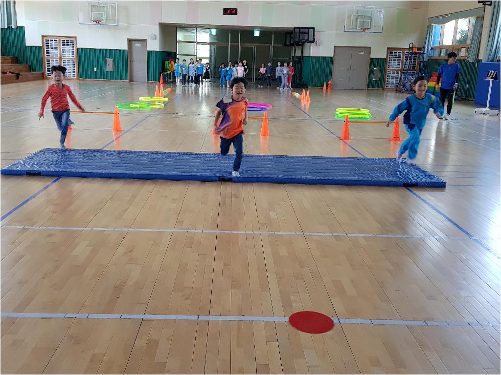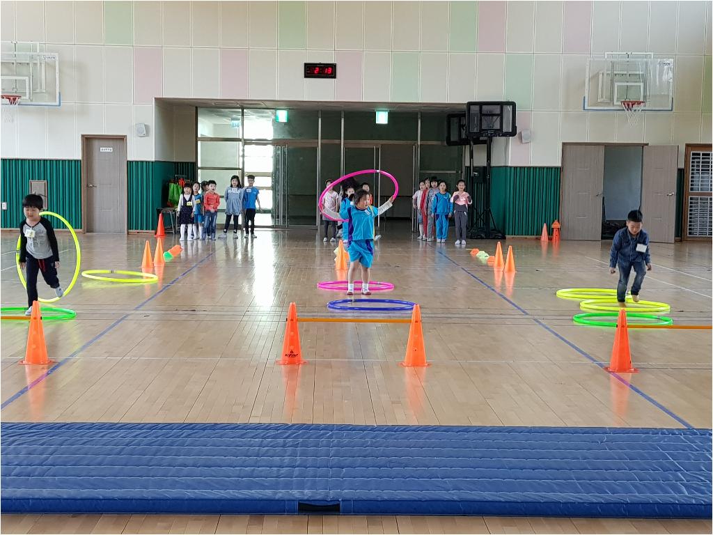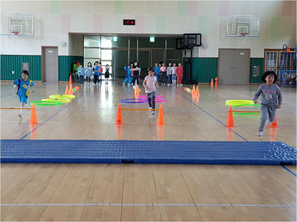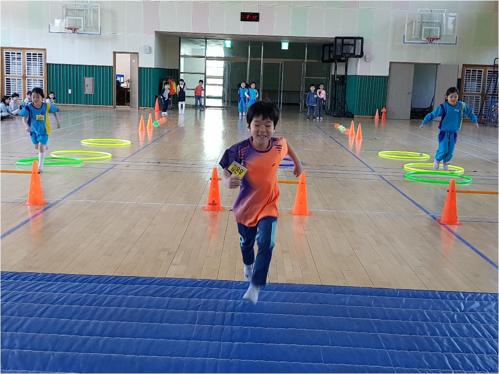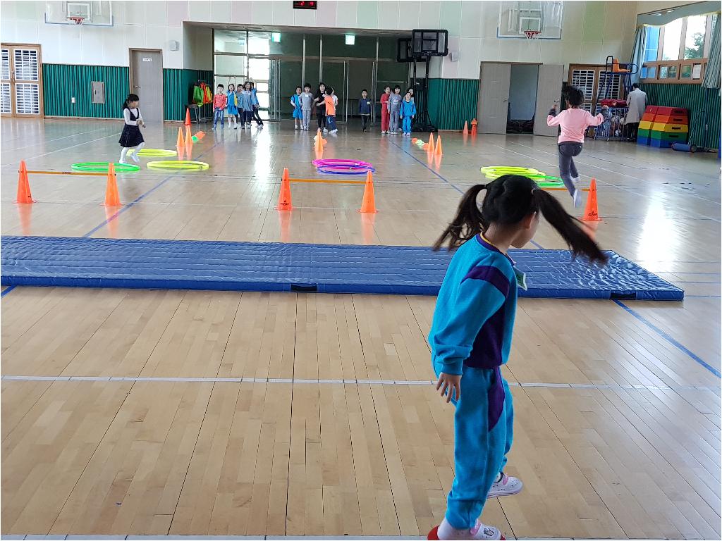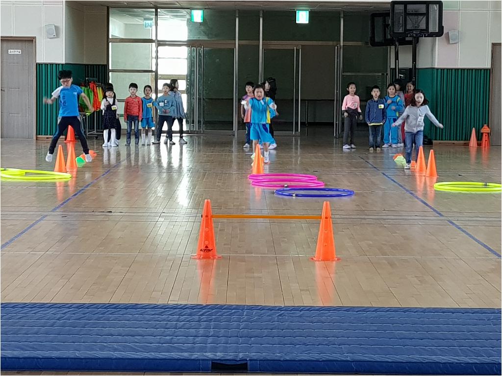 장애물 뛰어넘기 , 훌라후프 빼고 달리기 , 지그재기 달리기 장애물 넘어 달리기 .