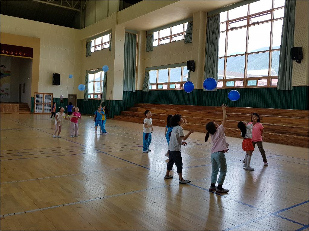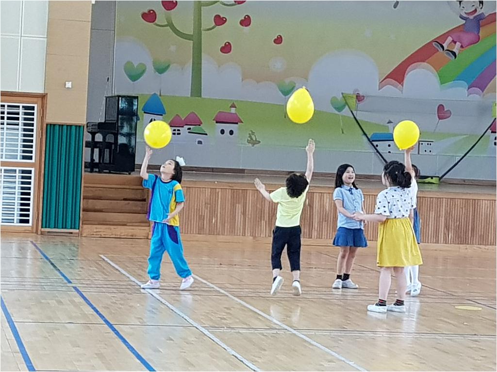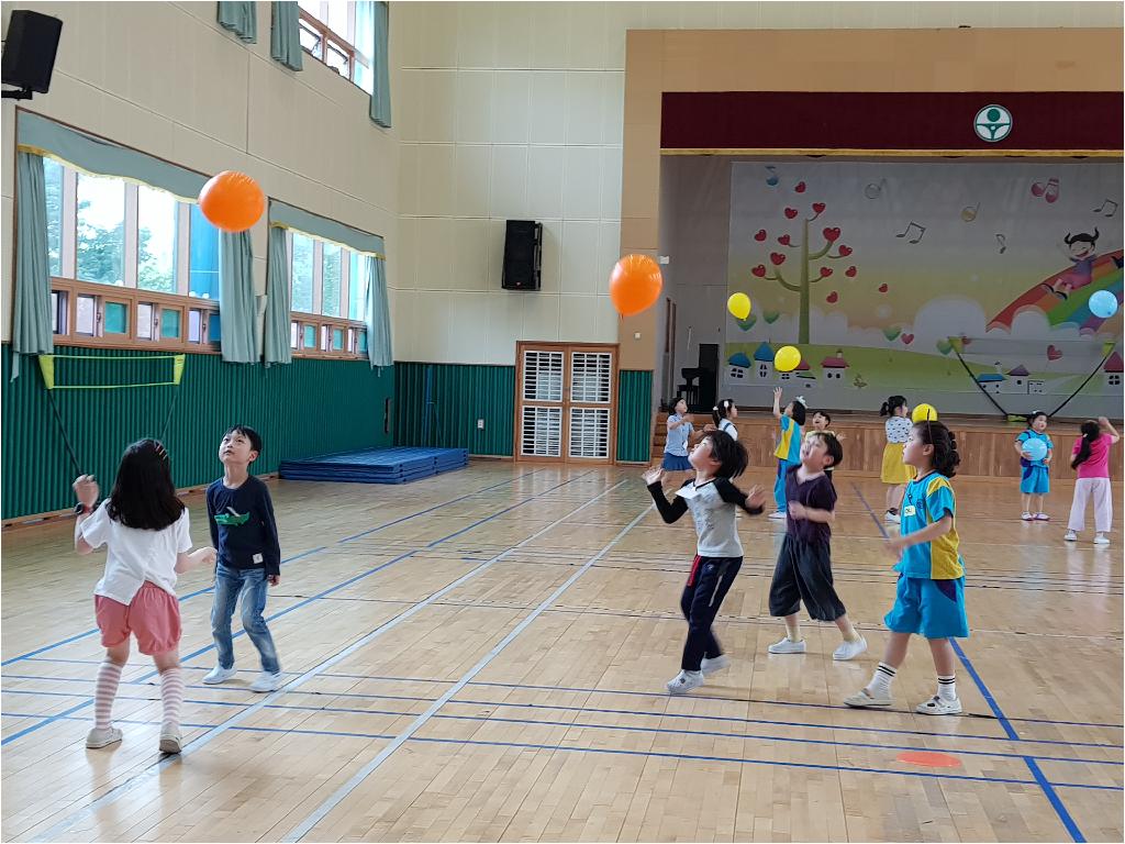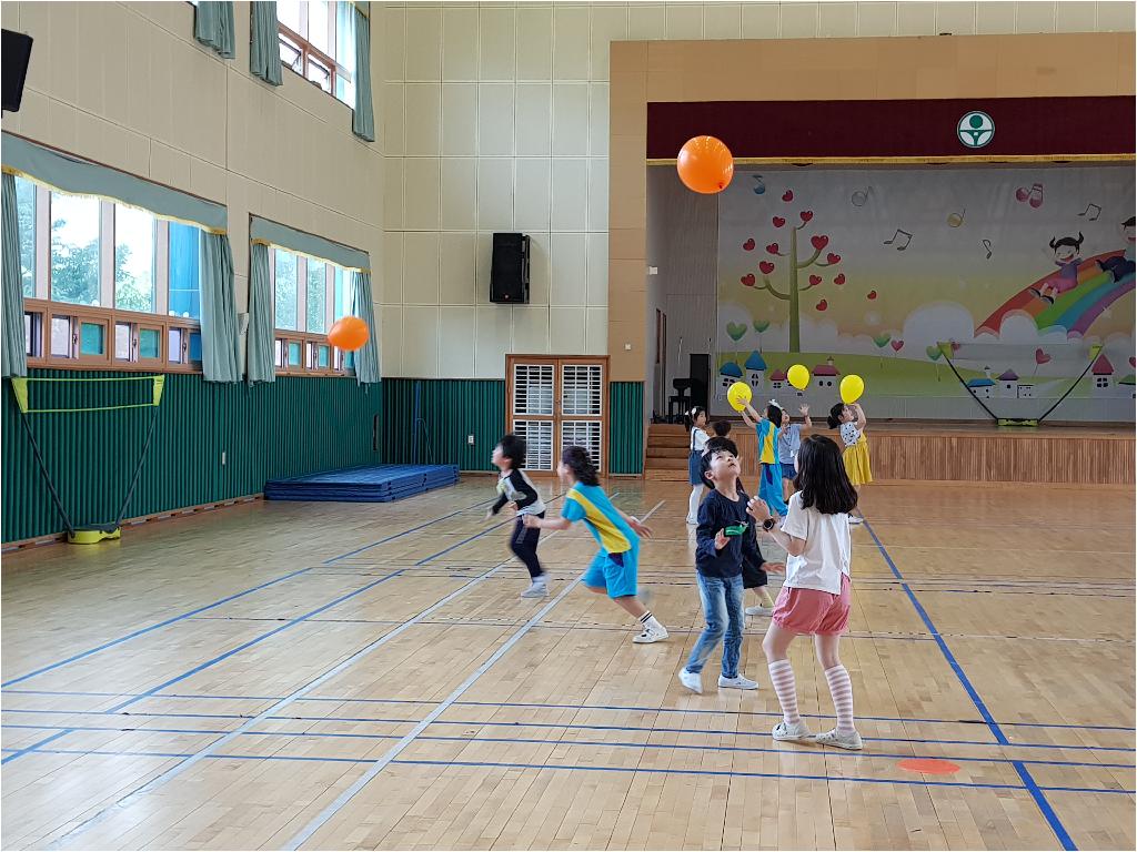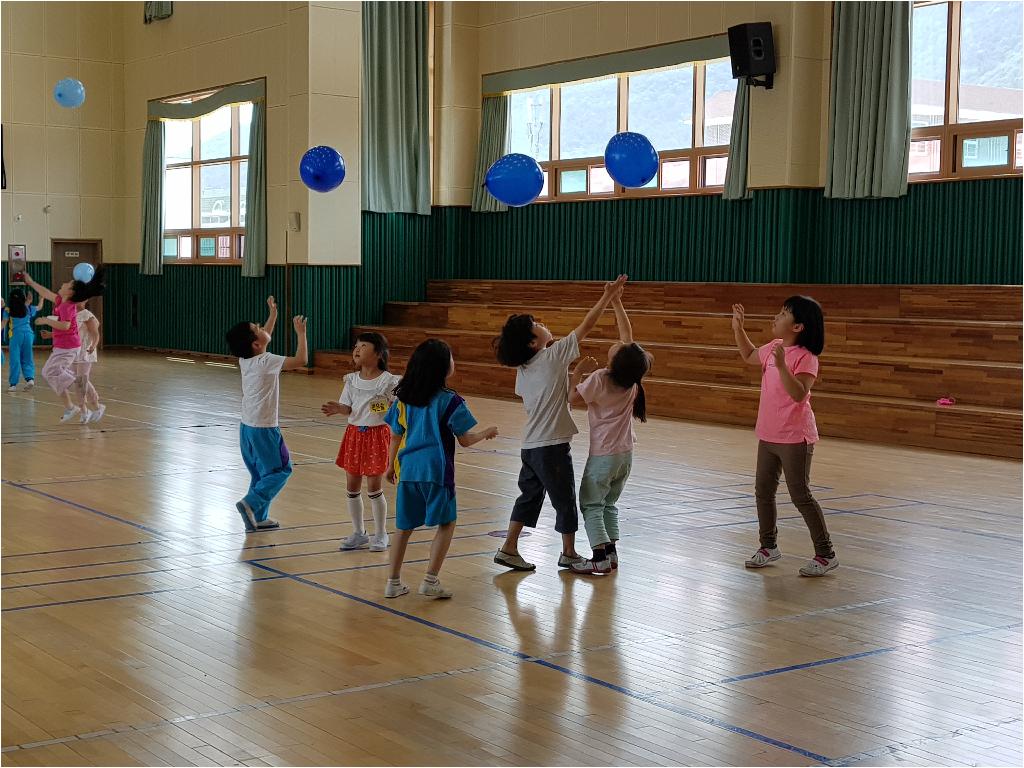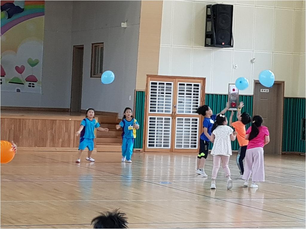 팀별로 풍선을 떨어뜨리지 않고 오랫동안 치면 이기는 놀이......