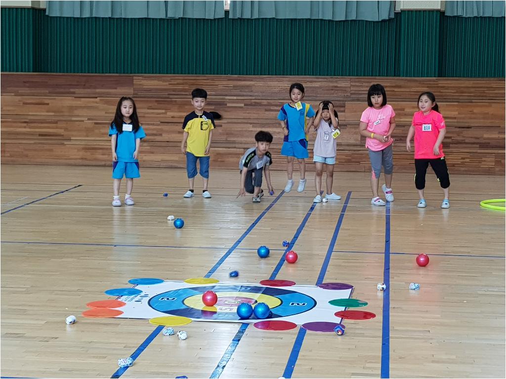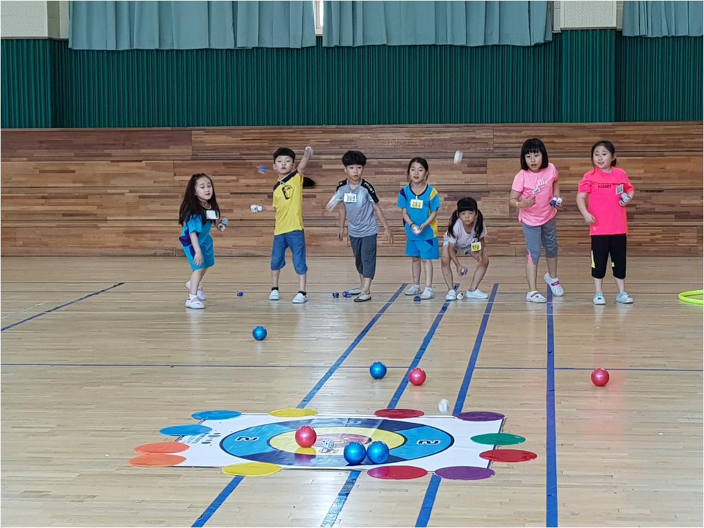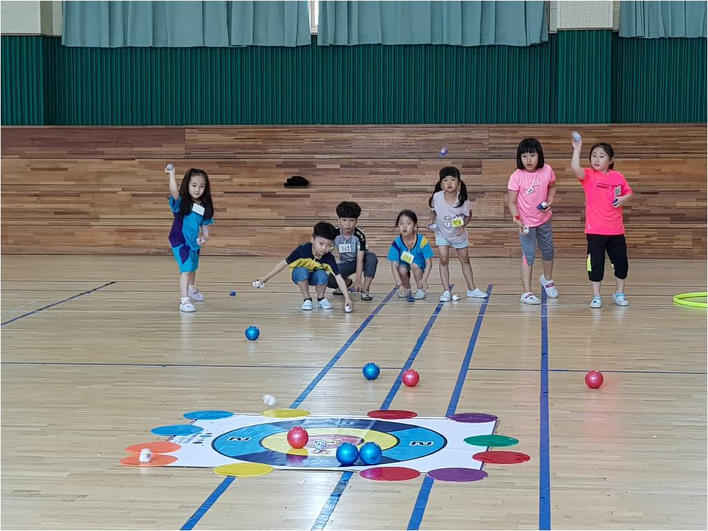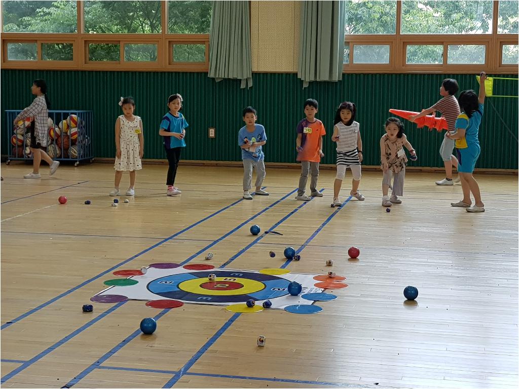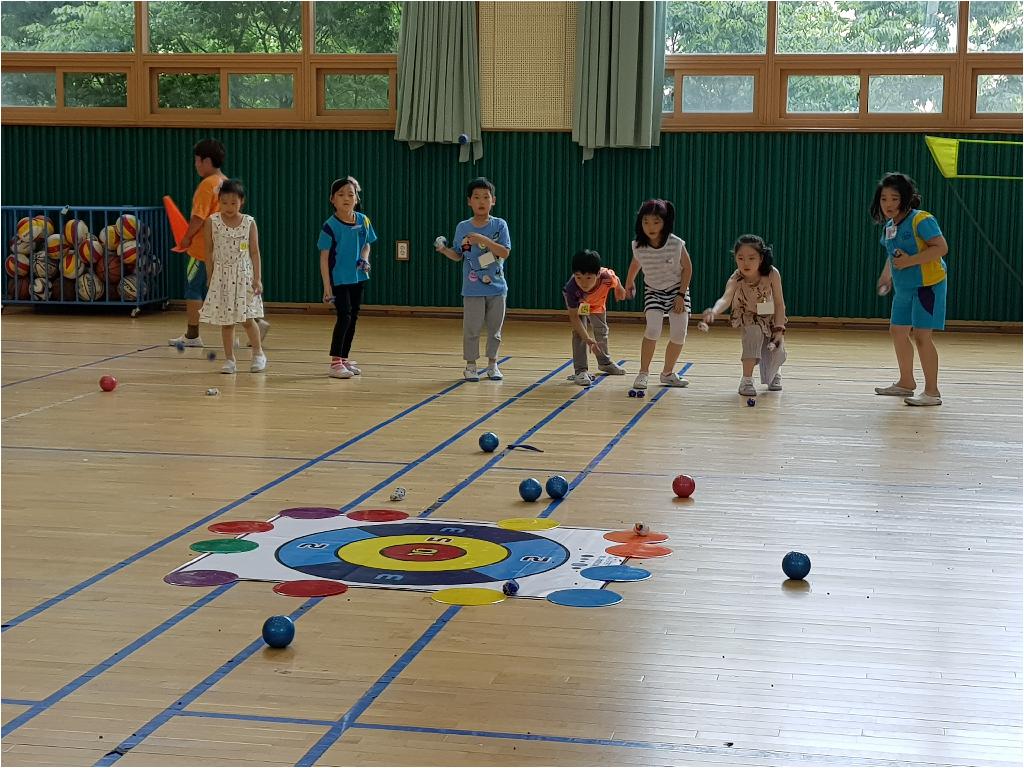 각편을 나누어 무대 중앙에 있는 과녁에 들고 있는 공와 콩주머니를 던져 점수를 많이 내는 게임이었습니다.